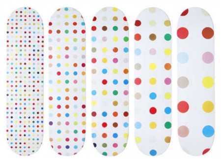 Damien Hirst ad esempio ha furbescamente messo in vendita nel suo shop Other Criteria delle tavole create per il brand Supreme per la modica somma di 2.000 dollari, si tratta di una tiratura limitata di 40 tavole firmate. C’è anche la possibilità di spendere meno ed accaparrarsi una tavola non firmata, ma lo scherzetto costa comunque 780 dollari, una cifra spropositata visto che una tavola decente costa all’incirca 100 dollari. Nel giugno 2010 alcune tavole da skate create da Jeff Koons e vendute all’asta da Phillips hanno raggiunto la ragguardevole cifra di 3.500 dollari mentre alla stessa asta le tavole di Takashi Murakami sono state vendute a 4.750 dollari. Niente male per delle semplici tavole da skateboard.