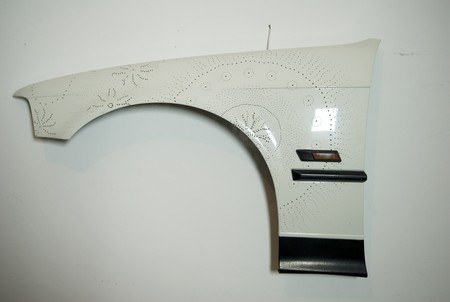 I disegni si ispirano a stoffe, tende e tovaglie decorate con motivi macramé che vengono trasferiti sugli oggetti tramite una meticolosa traforatura delle lamiere. Nel caso dei dischi è invece l’immagine di copertina a penetrare all’interno, trapassando il vinile. Sui frigoriferi appaiono l’effige d’innafiatoi e ventilatori. Infine nei tappeti tinti di nero, il colore dei motivi annodati scompare quasi del tutto, lasciando una debole traccia di disegno in negativo, come anche nel caso dei fori e delle incisioni che si notano su una pila di pneumatici, ovviamente neri.