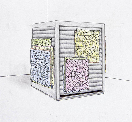 Piu’ di 100 manifesti in cartapesta, di diverso formato e interamente disegnati a pastello e china, sono offerti allo spettatore per essere letti singolarmente o sovrapposti, costituendo, cosi’, diversi contenuti.