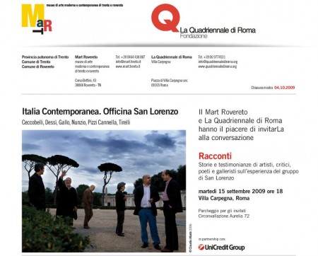L’incontro è promosso dalla Quadriennale e dal Mart, il Museo di arte moderna contemporanea di Trento e Rovereto, dove è in corso fino al 4 ottobre Italia Contemporanea. Officina San Lorenzo, la più vasta esposizione antologica dedicata finora ai sei artisti romani che trent’anni fa scelsero di fare pittura e scultura in uno stabile degli inizi del Novecento nel quartiere romano di San Lorenzo.
