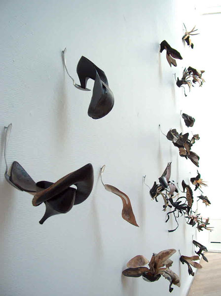 Così da masse d’indumenti affastellati uno sull’altro, sorgono landscapes impreviste impreziosite da una prospettiva rigorosa e da colori che sembrano seguire i toni della luce all’orizzonte. Al centro della galleria troneggia invece una meravigliosa installazione costituita da giacche incrociate fra loro che compongono un’architettura inusitata la quale riporta alla mente lo scheletro di un enorme cetaceo.Degne di nota anche le piccole installazioni a parete, sulla quale spuntano inattese infiorescenze intagliate da comuni scarpe da donna poste su cucchiai ritorti. Il tutto ricrea in maniera poetica nuovi archetipi visivi, partendo dalla dimensione ambientale e costruendo un modello paesaggistico senza precedenti che fonda le sue radici sul concetto del ritrovamento e del rinnovamento di forme e materiali.