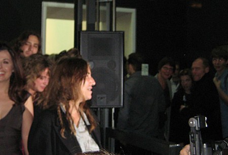 Quest’ultima essendo stata per diversi anni musa e grande amica del compianto fotografo non ha certo rifiutato il gradito invito. Il problema è nato a causa del troppo interesse del pubblico su questo evento del tutto unico. Alle ore 17:45, circa quindi minuti prima dell’entrata in scena di Patti Smith, un copioso nugolo di fans della cantante si accalcato di fronte all’entrata della galleria e non appena le porte dello spazio si sono aperte una lunga ed incessante fila di persone ha cominciato a riversarsi all’interno dei locali. Alla fine le due sale della galleria si sono riempite fino allo spasimo in un’atmosfera da concerto più che da mostra di arte contemporanea. Patti Smith alcuni minuti prima della sua esibizione si è sporta al di fuori della galleria e notando la grande folla ha esclamato scherzando: “C’è troppa gente, non posso entrare. Non dovete per forza vedermi, non sono poi così bella. In compenso potrete udirmi, abbiamo un ottimo impianto sonoro”. La cantante ha poi cominciato a stringere mani nella folla ed a congratularsi con la festante massa di avventori.