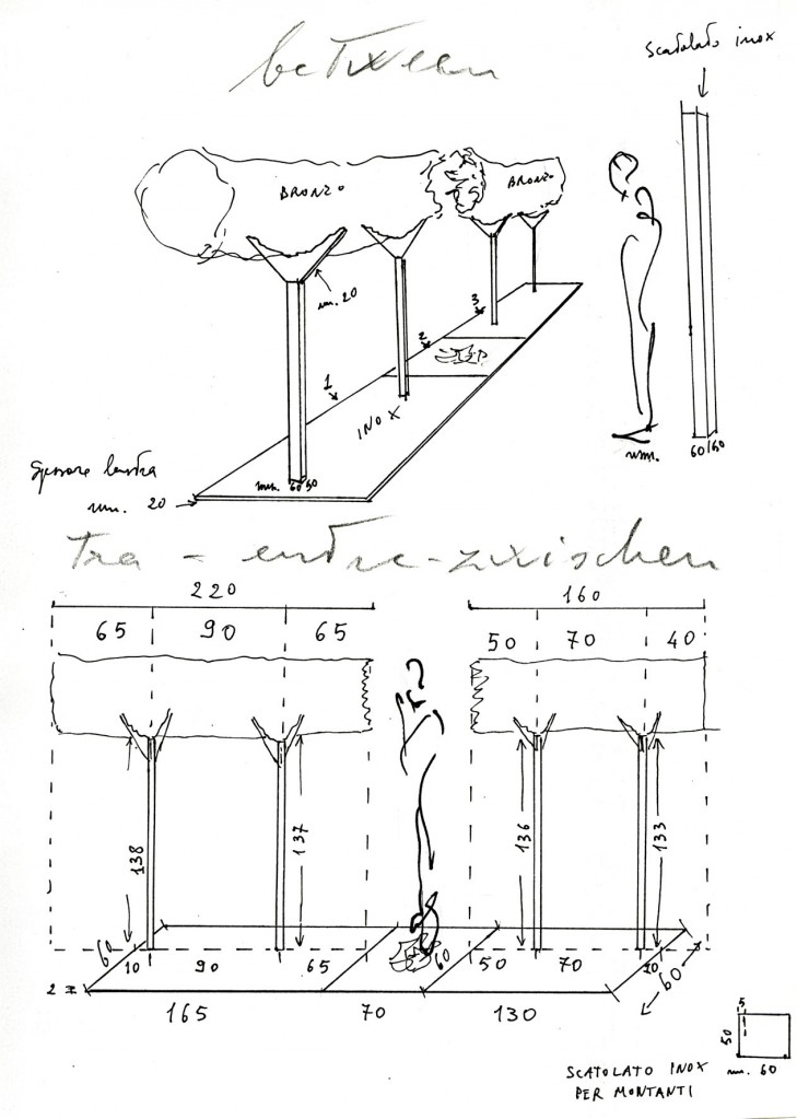 I “gesti” di Giuseppe Penone sono, fin dal 1968, accompagnati da fotografie, disegni e annotazioni come parti di un processo che in fine diviene scultura. Ed anche di questa esposizione il titolo ….. TRA ….. riecheggia in un breve pensiero scritto dall’artista, momento di riflessione: