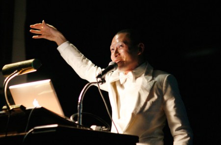 La performance è stata curata da Stacey Engman ed è stata appunto strutturata come una lezione sulla storia dell’arte accompagnata da diapositive delle opere e relativa spiegazione. C’è da dire che Terence Koh si è rivelato un ottimo professore, un istrione capace di catalizzare l’attenzione dei suoi studenti improvvisati e dirigere il discorso affidandosi alla sua creatività. Già perchè l’artista ha scelto di spiegare l’arte ad una platea in cui erano presenti anche Vito Schnabel, Mary Boone, Will Cotton e Marina Abramovic, gesticolando freneticamente e parlando una lingua non comprensibile. Koh ha quindi creato una performance nella performance, dimenandosi e blaterando a ripetizione mentre dietro di lui scorrevano le immagini di capolavori dell’arte creati da Rembrandt, Velázquez, Goya e Vermeer fino a giungere ai maestri del contemporaneao come Duchamp, Malevich, Cornell, Bacon, Mapplethorpe, Goldin e Hirst.
