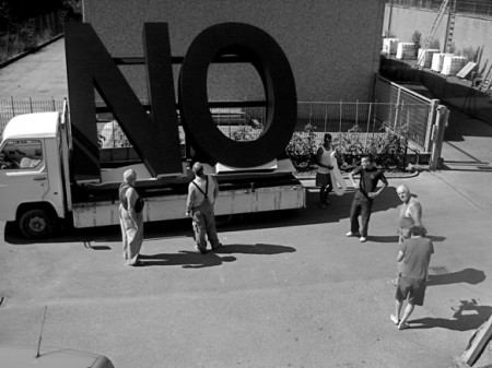 La scorsa settimana i cittadini di New York saranno stati decisamente sorpresi quando all’uscita della metropolitana o passeggiando per le vie della città si sono ritrovati un camion con agganciato un cassone su cui era posta una scultura itinerante di Santiago Sierra. L’opera è costituita da sole due lettere che vanno a formare la parola NO, atto di dissenso generico che dopo lo stop a New York (e dopo aver già girato per tutta Europa) si dirigerà a sud verso Art Basel Miami.