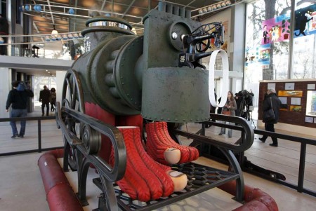 Alcuni dei suoi dipinti sono stati trasformati in trasparenze giganti e sono appiccicati su mura di vetro. L’artista ha inoltre creato installazioni interattive che si prendono gioco dell’arte. Il pezzo forte è una specie di locomotiva a vapore dotata di piedi giganteschi con tanto di calzini bucati. Un’altra installazione dal titolo The Japanese Imperial Army’s Secret Files è formata da modellini di animali trasformati in armi: una balena reca un caccia bombardiere sulla sua schiena ed un elefante porta un grande fucile. Alla mostra è presente un area dove i visitatori possono sparare palline di vernice ad enormi dinosauri di carta e c’è anche una macchina che produce dipinti di Jackson Pollock a caso. Tra chimere, sogni, cartoni animati ed ironia il genio artistico di Kitano è una divertente ed accessibile grandezza.