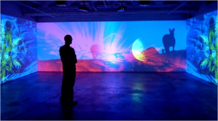 Su di un trittico sono proiettati delle forme sacre costituite da cerchi, triangoli e quadrati che si evolvono in cilindri ed altre configurazioni. Sull’altro trittico sono proiettate visioni astronomiche e biologiche come se si trattasse di una sorta di storia dell’universo dal Big Bang alla conquista della luna. Le 30.000 immagini proposte dagli artisti cambiano in maniera così veloce che sembrano quasi visioni subliminali. La qualità dell’effetto 3d non è proprio come quella di Avatar ma l’esperienza sensoriale è decisamente affascinante.