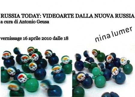 Russia Today: Video arte dalla Nuova Russia, evento organizzato dalla galleria Nina Lumer di Milano (dal 16 aprile al 28 maggio 2010) presenta opere di alcuni dei più apprezzati esponenti di arte contemporanea russa a livello internazionale: Viktor Alimpiev, Sergey Bratkov, Anna Jermolaewa e Vladimir Logutov, che hanno fatto (e continuano a fare) del video uno dei loro mezzi d’espressione più efficace. Nel loro continuo oscillare tra mise-en-scène e realtà quotidiana, tra plastica e pelle, tra caos e ordine, i video in mostra ci parlano, almeno in superficie, di questa Nuova Russia, temibile ed amabile allo stesso tempo.