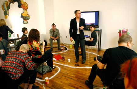 Ebbene lo scorso venerdì, Powhida ha colpito ancora con una performance del tutto irriverente che si è tenuta a New York. Titolo dell’evento: Surviving The Art World Using The Art of Sorcery (che in italiano suonerebbe come Resistere al mondo dell’arte utilizzando l’arte della magia). Ovviamente Powhida è sempre ben informato sui (molti) vizi e le (poche) virtù della scena statunitense e non manca mai di inserire nelle sue creazioni tutti i più piccanti gossip del momento. Davanti ad un cospicuo numero di persone Powhida ha cercato di spiegare il concetto di “valore” all’interno del mondo dell’arte e di illustrare l’inesplorato ruolo della magia. Powhida ha quindi effettuato dei veri e propri incantesimi spargendo sale in grandi cerchi sul suolo ed ha poi rivelato alcuni segreti del mondo dell’arte sotto forma di fiabe magiche. Protagonisti delle storie Jeff Koons, Larry Gagosian ed altri celebri personaggi dello starsystem dell’arte.