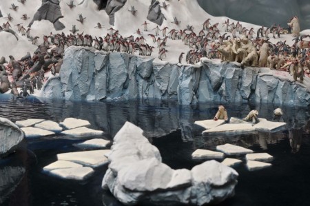In occasione della mostra a Milano presentano Unhappy Feet. Un plastico tridimensionale che sconvolge l’ordine delle memorie percettive dell’infanzia e che vuole essere un’allegoria della sofferenza e del male. Gli artisti hanno creato un mondo parallelo, in cui i pinguini sono i nazisti e i teneri orsi polari le vittime. Immaginate che il mondo venga ricoperto dai ghiacci: in questo ambiente glaciale sopravvivono solo animali. I pinguini devono abbandonare il Polo Sud per attraversare il mondo, divorando tutto cio’ che trovano. La loro destinazione finale? Il Polo Nord, dove attaccano brutalmente balene, trichechi e orsi polari.
