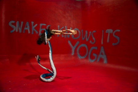 Da Giò Marconi ho osservato una Djurberg un pò opaca, senza quella carica emotiva che mi aveva rapita la prima volta. I due video, impietosi come sempre nel descrivere la condizione umana, sono un po’ faciloni. Rispettivamente: un uomo con un serpente incantatore e una donna con una rana velenosa ripresi (o meglio, modellati) in una specie di rituale spirituale. L’uomo, il serpente, il peccato, l’ascesi, il sesso, le sostanze allucinogene, i trip, i colori, Dio? Mah… Snakes know it’s Yoga recita il titolo della mostra, forse siamo noi che ci pensiamo troppo su.