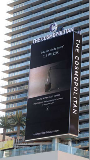 La scorsa settimana inoltre la città è divenuta teatro di una nuova serie di eventi artistici denominata Pause. Il nuovo casinò e resort Cosmopolitan è stato adibito a spazio espositivo per l’arte pubblica, nel primo evento di Pause che si protrarrà sino al prossimo 30 settembre. Solitamente Las Vegas è un luogo da maestri del contemporaneo, quindi Pause è un evento dall’alto profilo che non mancherà di stupire i visitatori proprio per la inconsueta location. Situato vicino il celebre casinò Bellagio, il Cosmopolitan dovrebbe inaugurare il prossimo dicembre ma alcuni dei suoi spazi sono già aperti ed ospitano i tre video del progetto Pause, uno di Yoko Ono e due di T.J. Wilcox che cambiano ad intervalli di 20 minuti. Le opere di Wilcox hanno a che fare con la natura, Filter presenta una giovane ragazza alle prese con una tartaruga in estinzione che nuota nella sua piscina mentre Eau de Vie de Poire ritrae l’artista mentre prova a produrre del brandy di pere nel cortile della sua residenza.