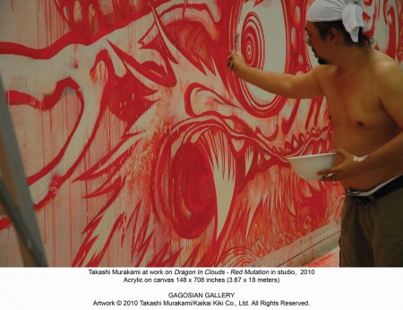 Il “drago rosso” fa riferimento all’eponimo romanzo di Thomas Harris, ispirato alla serie di acquerelli Great Red Dragon di William Blake, oltre che ai generosi poteri attribuiti dalla cultura orientale a questa creatura. In Dragon in Clouds – Indigo Blue, segni vorticosi circondano le pupille del drago e, assieme alle narici dilatate e ai baffi serpeggianti, creano un turbolento insieme visivo. Le dimensioni dei dipinti di Murakami rimarcano l’intensità psicologica necessaria alla creazione di un’immagine che ha provocato forti reazioni quando fu per la prima volta collocata nei templi giapponesi secoli fa. Nelle rielaborazioni monumentali di Murakami, il dragone diventa un elemento anticipatore del legame intrinseco fra arte e psiche.