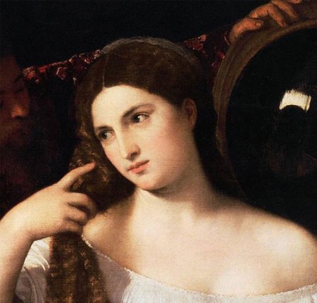 Il Comune di Milano, rendendo nuovamente accessibile ai cittadini e al pubblico la prestigiosa Sala Alessi di Palazzo Marino, consolida così i legami del Tiziano con la città, dove il pittore dipinse diverse opere tra cui L’Incoronazione di spine a Santa Maria delle Grazie, che fu teatro del fortunato incontro con Filippo II, figlio dell’imperatore Carlo V. In seguito alla loro conoscenza, il pittore produsse diversi quadri mitologici, sacri e ritratti per la corte, raggiungendo il massimo livello di prestigio internazionale per un pittore dell’epoca.Il dipinto raffigura una donna davanti un tavolo da toeletta, su cui è appoggiato un contenitore per unguenti e profumi; la ragazza vi intinge il dito indice della mano sinistra, mentre con il braccio destro si scioglie una ciocca di capelli e la unge con l’olio profumato. Sul fondo della scena si intravede una figura maschile in ombra, che con una mano porge alla fanciulla uno specchio piano, mentre, con l’altra, ne inclina alle sue spalle uno più grande, convesso, con una cornice di legno. Nello specchio convesso si nota come, con grande maestria, Tiziano abbia potuto raffigurare il riflesso della stanza con la figura della fanciulla di spalle e persino una anamorfosi scorciata del ragazzo. La caratteristica dello specchio convesso è infatti quella di dare una più ampia visuale deformando però le immagini in corrispondenza dei bordi della cornice. Così Tiziano, in questo dipinto, gareggia con la scultura fornendo su un unico piano bidimensionale due diversi punti di vista, ponendo anche le basi per il virtuosismo ottico ripreso poi dal Parmigianino. I due personaggi ritratti sono stati variamente identificati: alcuni hanno suggerito che potesse trattarsi di Alfonso d’Este e della sua amante, altri pensano che si tratti di un autoritratto giovanile di Tiziano con la sua amata, altri ancora di un dipinto che esalti la bellezza petrarchesca delle donne veneziane e le loro virtù, altri invece ritengono che si tratti più semplicemente di un ritratto ideale o una personificazione della Pittura.