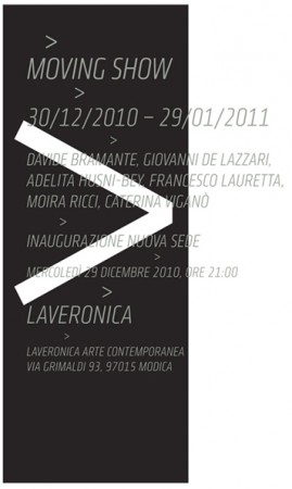 Mercoledì 29 dicembre 2010 LAVERONICA arte contemporanea presenta Moving Show, la mostra collettiva che apre al pubblico la nuova sede della galleria modicana. In mostra le opere di Davide Bramante, Giovanni De Lazzari, Adelita Husni-Bey, Francesco Lauretta, Moira Ricci e Caterina Viganò.