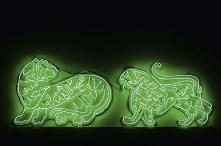 Il pensiero del mistico filosofo e poeta sufi Ibn Arabi (1165-1240), punto d’incontro fra la cultura araba e cattolica, il Doctor Maximus per gli europei, Il sommo Maestro per gli islamici, ispira molte opere in mostra. Nell’opera EL Thaherwa El baten (The Manifest and the Un-manifest) l’artista utilizza 12 volte la forma araba della parola Elhob (amore) per creare due cerchi, il primo visibile, il secondo in ombra sull’altro, fra il bianco dell’anima e il nero del corpo. Si oppongono ai cerchi, le bestie, i 5 leoni della propaganda islamica realizzati con più di 35.000 fiammiferi su legno (Oxymoron, 2011), simboli della forza, della ferocia, della potenza e del potere ma anche rappresentazione delle nazioni arabe all’interno della storia del mondo e dell’energia di ogni singolo individuo.