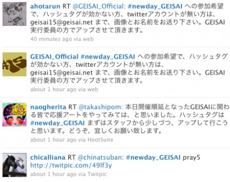 E’ per questo che, nella speranza di fornire coraggio a coloro i quali sono in questo momento colti dalla disperazione, vi chiedo di caricare immagini di opere d’arte all’interno dello spazio twitter di GEISAI”. Il popolo della rete ha prontamente risposto, inviando numerose opere per sostenere moralmente le vittime di questa indicibile tragedia.