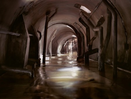 Casebere realizza maquettes tridimensionali, che fotografa dopo una ricostruzione in miniatura di ambienti esterni o interni, riproducendo i dettagli non solo architettonici, ma di acqua, pulviscolo e luce. L’estrema complessità del lavoro e la parallela produzione della serie “Landscapes With House”, per la Whitney Biennal 2010 di New York, avevano causato un rallentamento nella realizzazione finale di questa serie dei sotterranei, ora portata a termine.