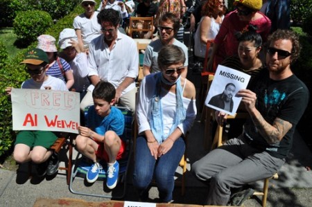 Il mondo della creatività (e non solo) è però stanco di queste assurde macchinazioni e lo ha dimostrato ancora una volta con grande fermezza. Proprio domenica scorsa si è svolta infatti una giornata di protesta internazionale denominata Creative Time, l’appuntamento simultaneo è riuscito a coinvolgere un folto drappello di attivisti sparsi per tutto il mondo. A New York 200 persone si sono assiepate davanti al consolato cinese, sedendosi su delle sedie proprio come la celebre performance Fairytale: 1001 Qing Dynasty Wooden Chairs, eseguita da Wewei nel corso di Documenta 12 a Kassel nel 2007. La protesta è partita da Facebook grazie all’impegno del curatore Steven Holmes, in seguito il popolo di internet ha risposto fisicamente, portandosi le sedie da casa. La protesta si è estesa anche a Los Angeles ed a San Francisco, mentre sul versante europeo città come Stoccolma, Dublino, Barcellona e Berlino hanno simultaneamente lanciato la loro pacifica manifestazione a cui hanno partecipato dalle 50 alle 200 persone. Alcune incidenti si sono verificati ad Hong Kong dove una folla di 150 manifestanti è stata caricata dalla polizia ma è risaputo che da quelle parti i diritti umani non sono rispettati in pieno. La pacifica manifestazione newyorchese è stata invece controllata dalla polizia che ha tentato di convincere i manifestanti a desistere senza riuscire nell’intento. Gli organizzatori della manifestazione hanno inoltre portato una sedia di quelle usate da Ai Weiwei durante Documenta 12 e l’hanno lasciata vuota per sottolineare l’assenza del coraggioso artista. Ancora una volta gridiamo a gran voce: FREE AI WEIWEI NOW!