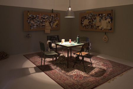 L’installazione, già presentata durante Manifesta 8, è una sorta di riproduzione in stile Disneyland degli ambienti posticci che si creano attorno ad uno scavo archeologico improvvisato. I tavoli di studio, l’angolo dello svago giocando a carte, la sabbia, le taniche, le fotografie sul muro. Un set costruito nei minimi dettagli di un luogo mai esistito, ma di cui noi possiamo fare esperienza.