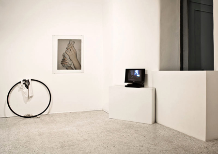 Lo spazio di Unosunove è su due piani, scavati nella corte interna di un palazzo d’epoca dietro al Duomo. Al primo piano troviamo una riflessione sull’ossessione per il corpo che coinvolge tutti noi e sullo potere dei media. Mentre nello schermo si susseguono ragazze intente a levigare i fianchi grazie alla pedana di una famosa consolle, viene da ridere: così goffe a fare movimenti convulsi nella loro stanzetta. Accanto, appoggiato sul muro un hula-hop, strumento che utilizzerebbero quelle ragazze se invece che di fronte alla tv avessero deciso di fare davvero l’esercizio di ginnastica. Sul muro un poster dall’estetica pubblicitaria mostra due mani che plasmano della terracotta. In quest’insieme così chiaro è come se l’artista riuscisse a rimettere al suo posto una questione la cui importanza dovrebbe essere relativa, ma che così non è.