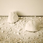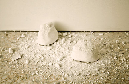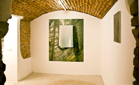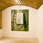 Ma è al piano di sotto, a mio avviso, la vera sorpresa. Non so se sia un effetto cercato o semplicemente determinato dalla situazione, ma le sfere i gesso rotte nel sotterraneo, forse a causa dell’umidità tipica da cantina, emanano un odore particolare. Come fossi entrata alle terme la sensazione si amplifica vedendo al muro l’opera Mountain Fresh (Dawn): su una fotografia di un bosco è appeso come fosse un asciugamano un telo di plastica sfumato. Il coinvolgimento dei sensi è totale e piacevole, a dimostrazione della forza dell’arte di farti stare semplicemente bene, come dopo un pomeriggio alle terme.