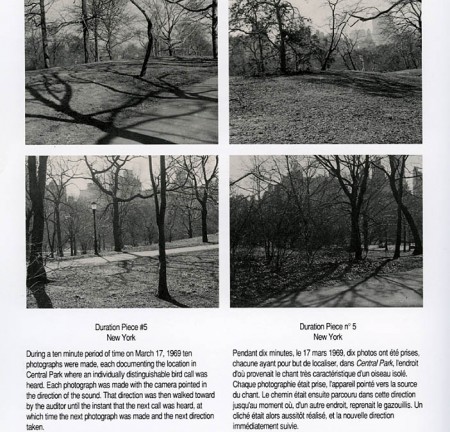 Una delle opere più significative di Huebler è senz’altro Duration Piece #5( del 1969), una serie di 10 fotografie in bianco e nero accompagnate da un testo che documenta l’intera azione. Per sviluppare l’opera, l’artista si è sistemato in un’area di Central Park a New York ed ha scattato una fotografia al canto di ogni uccello, puntando la macchina verso il suono udito ma scattando foto in un punto imprecisato. Il gradino più alto della poetica di Huebler è forse una serie di opere sviluppate a partire dagli anni ’80.