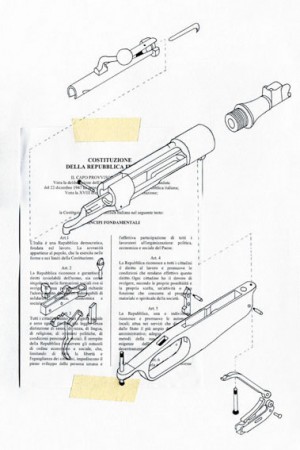 Ad accompagnare l’installazione, nove tracce audio ripropongono in maniera frammentaria alcune interviste ai protagonisti delle vicende in questione; interviste che fanno parte di un archivio che ricostruisce alcuni eventi bellici che si sono svolti nell’area orientale di Napoli e dalle quali l’artista ha ricavato le notizie relative alla tipologia di armi usate , le circostanze e gli umori dei protagonisti. La cartapesta con cui sono realizzate le armi è ottenuta utilizzando le pagine della Costituzione Italiana. Questo procedimento era già stato utilizzato da Domenico Antonio Mancini nella realizzazione dell’opera Senza Titolo (2010), che consisteva in una rastrelliera di fucili, moschetti, utilizzati dai partigiani contro le truppe nazi-fasciste. Entrambi i lavori si legano ai contesti territoriali in cui sono presentati e reagiscono a un clima preciso. Rispondono a una necessità di memoria. Oppongono al rischio di offuscamento e ai tentativi di sabotaggio della storia, una chiarezza formale e linguistica che corrisponde a un pensiero inequivocabile. Gli elementi considerati, la Costituzione Italiana e le armi d ella Resistenza, diventano durante l’ elaborazione formale del lavoro i termini di un’ affermazione tautologica. Se la Costituzione è la materia con cui l’ artista riproduce le armi con cui si combatté la Resistenza, il suo pensiero è inequivocabilmente chiaro: gli elementi in questione presentano una mutua derivazione, il soggetto e il predicato si rispecchiano.
