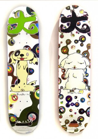 Damien Hirst ad esempio ha furbescamente messo in vendita nel suo shop Other Criteria delle tavole create per il brand Supreme per la modica somma di 2.000 dollari, si tratta di una tiratura limitata di 40 tavole firmate. C’è anche la possibilità di spendere meno ed accaparrarsi una tavola non firmata, ma lo scherzetto costa comunque 780 dollari, una cifra spropositata visto che una tavola decente costa all’incirca 100 dollari. Nel giugno 2010 alcune tavole da skate create da Jeff Koons e vendute all’asta da Phillips hanno raggiunto la ragguardevole cifra di 3.500 dollari mentre alla stessa asta le tavole di Takashi Murakami sono state vendute a 4.750 dollari. Niente male per delle semplici tavole da skateboard.