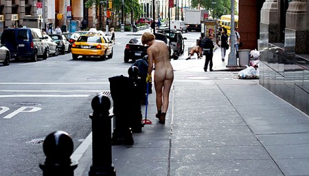 Le borse internazionali fino ad oggi hanno lanciato segnali allarmanti e Wall Street è fra le prime di una lunga lista. La borsa è però il tempio del capitalismo e non tutti gli americani sono in linea con gli assurdi principi del capitalismo. Uno di questi cittadini è l’artista Zefrey Throwell che la scorsa settimana ha portato a termine una sua performance di fronte a Wall Street, assumendo una posizione critica nei confronti di questo “mostro” economico. Throwell ha preso ispirazione da sua madre, una donna di 60 anni che ha perso tutti i suoi risparmi nel crollo finanziario ed ha dovuto ricominciare a lavorare per guadagnarsi da vivere dopo la pensione. Successivamente l’artista ha reclutato circa 50 performers, vestiti da traders, avvocati, segretarie ed altre figure che solitamente si possono trovare all’interno degli edifici della borsa ed ha dato luogo alla sua performance intitolata Ocularpation: Wall Street. In parole povere i 50 performers si sono recati a Wall Street ed una volta in strada hanno iniziato un vero e proprio strip tease, al termine del denudamento i performers hanno raccolto i loro abiti e si sono rivestiti.