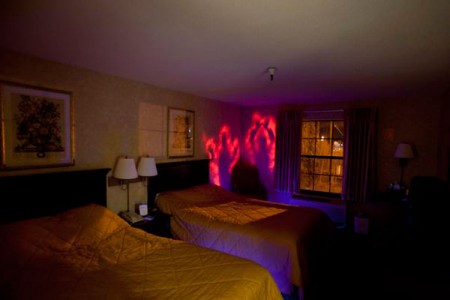 Tra il cordoglio e l’emozione però, qualcuno ha deciso di aggiungere un altro insulso capitolo al dramma statunitense. Stiamo parlando del noto street artist Zevs e del meno noto fotografo Jonathan Hobin, i quali se si conoscessero potrebbero formare una bella coppia di artisti babbei. Zevs ha scelto di creare una nuova opera sulle pareti di una stanza di motel. Ovviamente non si tratta di una stanza comune ma la tristemente nota stanza 233 del Comfort Inn al numero 90 di Maine Mall Road di South Portland, nello stato del Maine. La stanza 233 fu l’ultimo rifugio conosciuto dei terroristi che portarono a compimento gli attacchi dell’11 settembre. La scelta della location è senz’altro macabra ma il peggio deve ancora arrivare. Zevs ha infatti dipinto sulle pareti due figure simili a dei fantasmi, i soggetti sono visibili solamente se vengono esposti a delle luci UV, altrimenti nessuno può accorgersi della loro orribile presenza. Anche la proprietaria del Comfort Inn ha dichiarato alla stampa di non aver notato nulla di strano all’interno della stanza. A questo punto viene da chiedersi che senso abbia un murales del genere.