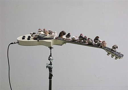 Céleste Boursier-Mougenot (classe 1961) è un artista visivo francese che trova del potenziale musicale in qualsiasi cosa ed esplora la musica in relazione alla teoria del caos e alla quotidianità. Negli ultimi due decenni, le avventure soniche dell’artista francese si sono misurate con aspirapolveri che hanno suonato come fisarmoniche, con stoviglie fluttuanti che sono diventate strumenti a percussione, con suoni della strada processati e rielaborati. E, in particolare, con uccellini, che hanno suonato chitarre e percussioni nella più poderosa tradizione della musica indie e sperimentale, producendo un incrocio musicale fra Sonic Youth e avanguardia.