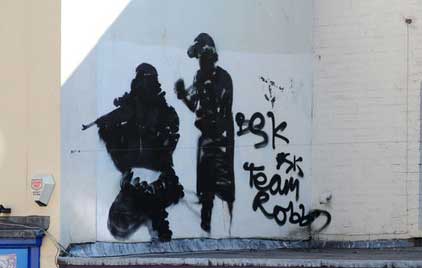 Giungiamo quindi a fatti più recenti: non molto tempo fa Banksy si è preso un’ulteriore rivincita, anteponendo le lettere FUC ad un tag recante la firma King Robbo, trasformandolo in una chiara offesa al padre della street art britannica. In seguito Robbo è caduto sbattendo la testa mentre si trovava all’interno della sua abitazione, finendo così in coma farmacologico. Il team Robbo, formato da suoi giovani seguaci ha proposto quindi una tregua a Banksy, chiedendogli di mettere a disposizione una sua opera per un’asta di beneficenza a favore dello sfortunato re. Banksy non ha risposto all’appello e questo fatto, unito alle sue precedenti azioni di bombing, ha mandato il Team Robbo su tutte le furie. Con il re fuori combattimento bisognava pur compiere un’azione di difesa ed allora la crew di Robbo ha deciso di colpire l’eroe mascherato della street art nella sua città natale, vale a dire Bristol. Il Team Robbo ha scelto di agire su uno dei murales più celebri, quello raffigurante un tiratore scelto della polizia con alle spalle un bimbo in procinto di far scoppiare una busta di carta. Il murale è stato completamente ricoperto da vernice nera e successivamente firmato “Team Robbo”.