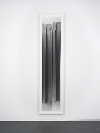L’appartamento ha offerto a Beasley uno spazio tridimensionale attraverso il quale meditare più approfonditamente sul suo interesse verso la fotografia. The Outside è una mostra dove lavori fotografici incorniciati diventano opere scultoree. Le dimensioni delle cornici di cedro sono tutte basate sui progetti di un paio di porte scorrevoli che Mollino disegnò specificatamente per l’appartamento, ma che alla fine non realizzò perchè decise di utilizzare delle porte pieghevoli. Tre sculture verticali, Nolens Volens (u), (r), (i) sono presentate nella sala principale della galleria. Le stampe di pizzi biancho Chantilly sviluppate a mano dall’artista sono appese libere nelle loro cornici, il retro della stampa è visibile ma è sempre visto in relazione con l’immagine del pizzo del pannello adiacente. L’attenzione si sposta attraverso la superficie dell’immagine, le ombre si confondono nelle aree basse mentre vetri acrilici colorati danno ad alcune sezioni della fotogrofia un tono giallo pizzo e arancione delicato. E’ la prima volta che l’artista usa pannelli fotografici nelle sue composizioni scultoree in questo modo. Il titolo di questo lavoro, Nolens Volens, deriva dal latino e significa Nolente Volente, che è diventato il modo di dire: Volente o Nolente. Viene proposto un incontro casuale, nel quale non si prendono in considerazione le conseguenze; per Beasley Nolens Volens è un modo di considerare cosa potrebbe essere una foto senza fronte nè retro, semplicemente come un’esperienza senza queste opposizioni. Giallo è il colore dell’amicizia; arancione è il colore dell’affetto. Questo è The Outside.