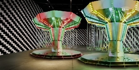 Dal 1° dicembre 2011 al 26 febbraio 2012 al MACRO di Roma sarà possibile visitare, con ingresso gratuito, l’opera “Double Carousel with Zöllner Stripes“, una doppia giostra in movimento collocata negli spazi della grande sala Enel al pian terreno, tra le più ampie sale espositive attualmente presenti in Europa. Qui il pubblico potrà anche interagire con le due giostre ideate dall’artista che, muovendosi in senso opposto, a velocità molto ridotta, consentiranno ai visitatori di salire e scendere liberamente, come fossero enormi mulini o macine in cui le persone, sedute sopra, si avvicinano e si allontanano in un moto rotatorio costante. Intorno, linee visive dalle trame apparentemente incrociate (“Zöllner Stripes“), creeranno un effetto complessivo di grande suggestione. Un’esperienza che modifica la percezione dello spazio generando una visione rallentata della realtà.
