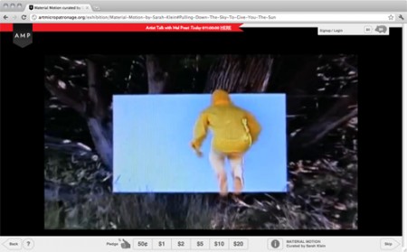 Ebbene, ogni opera di net art presente in mostra è corredata da un piccolo bottoncino che permette al fruitore di effettuare una donazione in tagli da 1, 2, 5, 10 e 50 dollari. Le somme vengono depositate in una sorta di carrello della spesa e dopo aver visto tutte le opere in mostra si passa al relativo check out. Una piccola somma viene trattenuta dall’AMP che in tal modo paga le spese di hosting del sito e l’onorario dei curatori. Il resto, vale a dire l’85 percento del totale raccolto, viene direttamente versato nel conto corrente degli artisti. Questa soluzione ci sembra a dir poco innovativa e speriamo serva a tenere in vita un medium dal breve passato ma dal grande futuro.