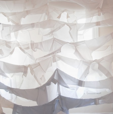 L’installazione si compone di due strutture simmetriche che evocano lo scheletro di una grande barca. La semplice carena è sezionata in due parti che si sviluppano dal soffitto fino a tangere il pavimento, con un medesimo ritmo compositivo semicircolare realizzato con abiti annodati tra loro. Per la scelta dei colori che delineano le due strutture complementari, gli abiti suggeriscono un dialogo simbolico tra il maschile e il femminile: chiari da un lato, dai toni più freddi dall’altro. Dal tutto emana una combinazione coloristica di armonica bellezza.