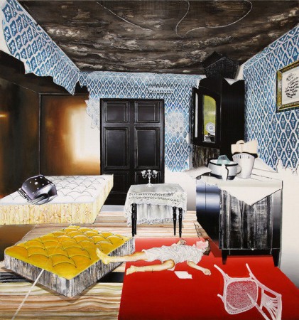Negli ambienti deteriorati riprodotti tutto sembra prossimo al crollo, con le pareti e i soffitti coperti di muffa e macchie d’umido, la carta da parati staccata, lo stucco sbriciolato e i muri danneggiati. Oggetti, vestiti, mobili sono accatastati e sparpagliati ovunque, creando luoghi apparentemente inospitali. Nelle sue tele si osserva una cura impressionante nella resa dei dettagli e delle superfici: la grana dei pavimenti in legno, la morbidezza dei tappeti, l’umidità di un muro di pietra in procinto di crollare.Le stanze sono popolate da una o più figure che, come spiega l’artista, “con tagli di capelli e vestiti peculiari sembrano appartenere a tempi remoti del passato, irradiando ancora una certa immediatezza appartenente ai nostri giorni. Nonostante la giocosa interpretazione del bizzarro fenomeno della decadenza, questi particolari protagonisti sembrano sentirsi a casa loro. Tra le figure e le stanze sembra instaurarsi, per così dire, una reciproca e intima comprensione.”