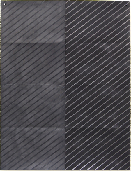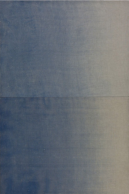 PERCHÈ: Lo spirito delle nuove generazioni è diviso tra tradizione e innovazione e l’ibrido che ne nasce è sicramente da conoscere per il futuro, poi ognuno potrà scegliere la strada che preferisce. Con Ned Vena si torna ai giochi prospettici optical, ma grazie ad un lavoro certosino con cui il vinile viene incollato su lastre di alluminio. Un bassorilievo lieve ed ipnotico. Hugh Scott-Douglas invece recupera la tecnica del cianotipo, una stampa fotografica in cui viene utilizzato il Blu di Persia, creando moderni monocromi sfumati. D’altronde non è più tempo del colore puro. Nazafarin Lotfi, moderna Rauschemberg, alterna sulla tela ritagli di carta, con graffette, nastro adesivo, filo da pesca, ma sulle sue tele il bianco e il nero spadroneggiano. Dan Shaw-Town invece trasporta su carta le geometrie di Carl Andre, un uso della grafite strabiliante. Infine N. Dash col suo approccio sciamanico, sceglie il pigmento indaco per colorare la stoffa, ma ciò che colpisce è la proprietà scultore della stoffa sospesa.