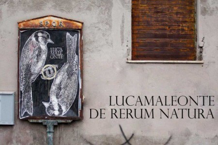 Con De Rerum Natura, Lucamaleonte apre un viaggio all’interno di icone che celebrano l’estetica e la scienza. Come il pensiero di Lucrezio riconduce l’origine all’aggregazione degli atomi nello spazio infinito, così l’artista attraverso l’unione di campiture differenti crea un archivio di bestie che vivono solamente se in relazione. Una natura che si alimenta con il mortifero e l’esoterico, concepita intorno al simbolo, che ancora prima di essere rappresentazione rubata alla tradizione, incarna le esperienze personali dell’artista.