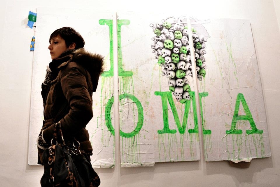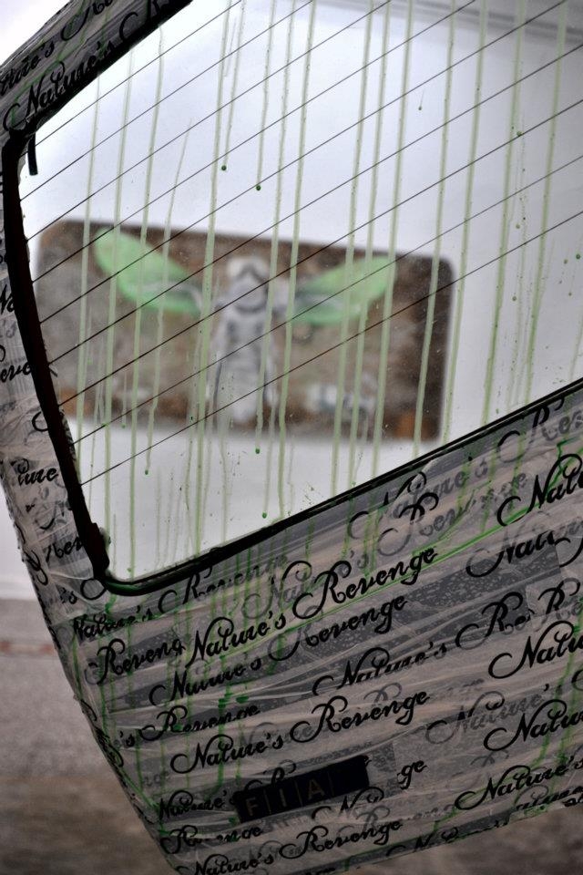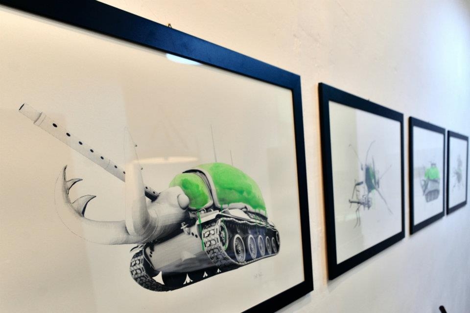 Entrando nello spazio espositivo il fruitore resta abbagliato dal verde acido che caratterizza le serie su carta “Nature’s Revenge” e “Bugs” dove eleganti, e al contempo inquietanti, immagini di piante e animali dal sapore surreale sono accostate a elementi paradossali e inconciliabili. Insetti un tempo innocui, si evolvono e si trasformano sotto il nostro sguardo in ibridi meccanici e tecnologici per sopravvivere e difendersi dal temuto aggressore, preparando la loro vendetta. Nell’opera ‘I love Rome’ la parola‘amore’ è contemporaneamente cuore e teschio, vita e morte. Una forte metafora che, illustrata con pochi mezzi, evoca una potenziale e imminente catastrofe causata da una società incurante dell’ambiente che la circonda e affamata solo di consumo, lusso e progresso.