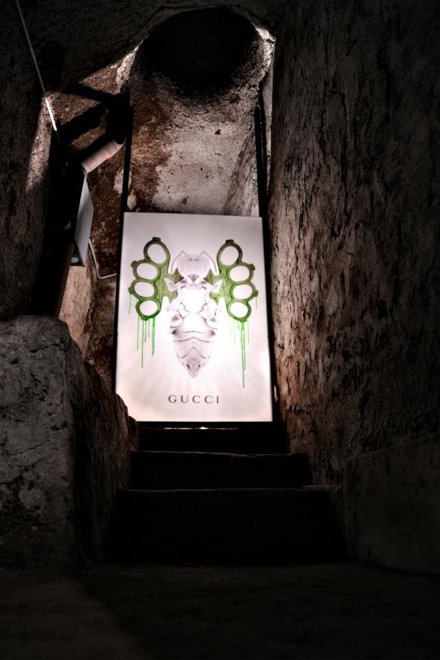 Estro e lucidità non mancano di certo al writer francese che, per il suo ultimo lavoro, sferra un attacco durissimo nei confronti dell’attuale estetica del bello e della perfezione promossa dai prestigiosi marchi internazionali (Gucci, Calvin Klein, FIAT o Chanel) che bombardano il consumatore medio con le loro pubblicità e slogan da sogno. Un progetto acuto, concepito per essere ubicato in luoghi banali e comuni come le pensiline degli autobus. Scendendo nel sotterraneo della galleria lo spettatore è invitato a entrare in piccoli vani, catturato e incuriosito dalle luci soffuse provenienti da quattro imponenti Light-boxes su cui sono stampati i “Co-Branding”. Icone accattivanti, caratterizzate da ossessive colate acid green, dove api e cavallette si tramutano in armi da guerra rivelando la loro potenza ammaliante.