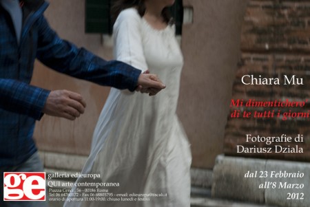 Chiara Mu ha interagito con i passanti in modo intimo e personale, stabilendo una relazione di scambio in uno spazio quotidiano condiviso, seppur di passaggio. Quest’intervento è testimoniato dalle immagini realizzate dal video-maker e fotografo Dariusz Dziala. La mostra che inaugura il 23 febbraio presso la Galleria Edieuropa di Roma vedrà l’artista proporre l’attraversamento della galleria, accompagnando i visitatori nel percorso emozionale di quell’intervento veneziano, camminando con essi attraverso le immagini e gli scritti prodotti durante lo stesso.