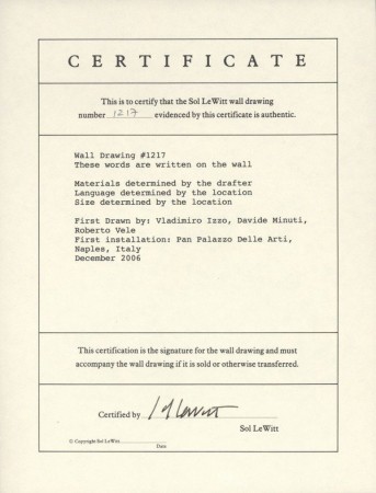 Quello che invece vedremo è il certificato di autenticità dell’opera. La mostra in questione è In Deed, ospitata dal 24 febbraio al 3 marzo 2012 dal Nero Magazine Headquarters di Lungotevere degli Artigiani, 8 in Roma. Si tratta di una mostra itinerante curata da Susan Hapgood e Cornelia Lauf, accompagnata da un completo catalogo illustrato con testi dei curatori, Lorenzo Benedetti, Martha Buskirk, e Daniel McClean. L’affascinante spunto curatoriale tende quindi a sottolineare l’importanza di un elemento che al tempo stesso valida e rende mercificabile l’opera d’arte. Il certificato di autenticità è dunque una prova legale, un documento fiscale che riassume in maniera algida e spartana l’essenza stessa della creatività individuale. Esso è in grado di aprire una confronto fra consistenza estetica e natura pratica di ogni oggetto o forma, spostando l’attenzione su parametri spesso sconosciuti al fruitore. Allo stesso tempo tale documento rappresenta una testimonianza affascinante in termini di mitologia e mitopoiesi dell’opera d’arte.