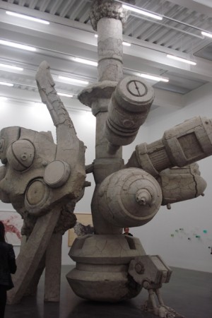 Ecco quindi che, come all’interno di una tragicomica sindrome da spogliatoio, gli artisti fanno gara a chi ce l’ha più lungo, tentando di surclassare ogni record mondiale. Proprio in questi giorni Adrian Villar Rojas ha piazzato la sua mastodontica scultura A Person Loved Me (2012) al New Museum per l’attuale edizione della pluriblasonata Triennial. Come già visto in occasione della Biennale di Venezia, Villar Rojas ha realizzato una delle sue strutture in bilico tra fantascienza, robotica e cultura manga, totalizzando l’intero spazio sino al soffitto. L’artista Turco Serkan Ozkaya ha invece scelto di copiare nientemeno che Michelangelo, realizzando un David tutto d’oro ed alto la bellezza di 9 metri. Questo autentico capolavoro del kitsch intitolato David (Inspired by Michelangelo) passerà dalle parti dell’Armory Show di New York per poi trasferirsi nella sua definitiva destinazione, vale a dire nel 21c Museum di Louisville nel Kentucky.