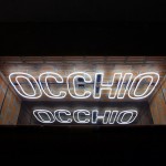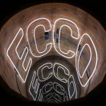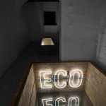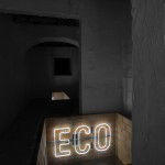 Per l’occasione si accede nell’unico ed articolato vano espositivo da un entrata secondaria, posta lungo il corridoio che collega la strada di san pietrini con un’accogliente cortile, in cui il banchetto inaugurale si esaurisce in futili chiacchiere. Oltrepassato lo stretto uscio lo sguardo del fruitore si perde nell’oscurità. Tuttavia, il suo occhio è attratto e guidato nell’esplorazione del luogo dai neon posti all’interno di sette ‘falsi pozzi’ di varia forma, dalla quadrata alla circolare, alla triangolare, realizzati in mattoni e cemento. Affacciandosi in essi lo spettatore si appresta a leggere scritte di luce, reali ed illusorie nello stesso tempo (ODIO, ECCIDIO, ECCO, OCCHIO, EX, BECCO e ECO), che si ripetono all’infinito nel vuoto grazie ad un gioco di rifrazioni. Solo la metà inferiore di tali parole è effettivamente rappresentata con i tubolari luminosi incurvati, mentre l’altra è riflessa in uno specchio: ne deriva una duplicazione speculare che rende visibile anche la parte immateriale.