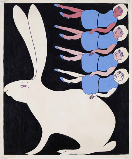 La favola di Alice contiene talmente tanti spunti da poter essere interpretata in modi sempre nuovi: il passaggio dall’infanzia all’età adulta; il rapporto tra linguaggio, significato e nonsense; l’influenza ambientale sullo spettatore; il confine tra realtà e percezione. Così nelle ultime sale dell’esposizione si arriva fino ai giorni nostri, con opere diverse e trasversali all’opera letteraria, dalle fotografie di Francesca Woodman, ai video di Douglas Gordon e Pierre Huyghe, dai disegni di Kiki Smith, ai collage di Liliana Porter.