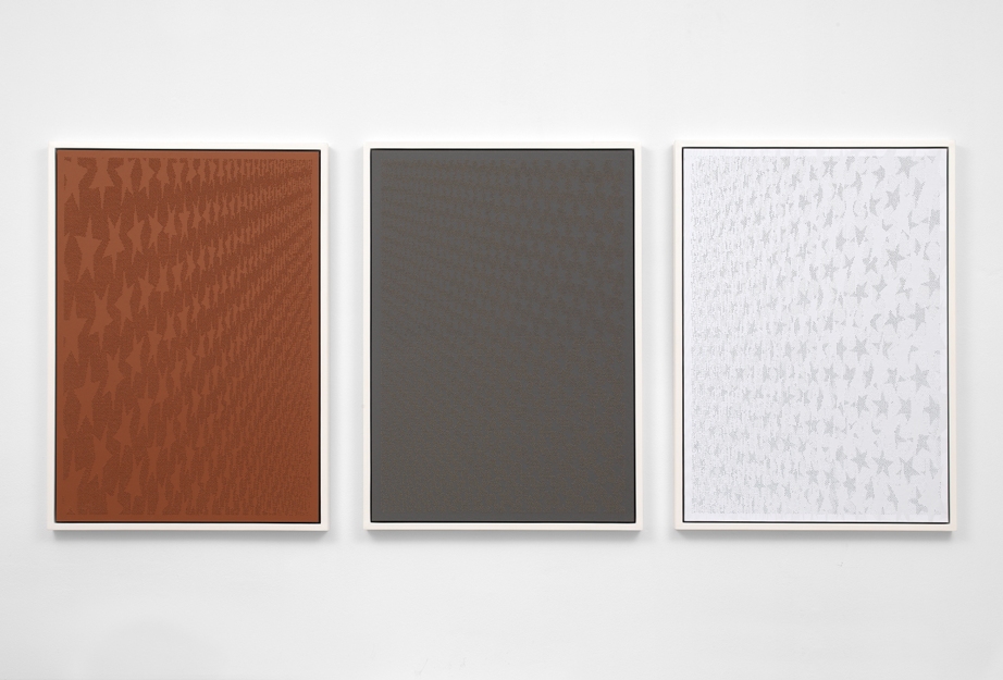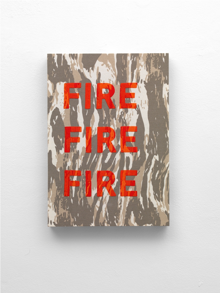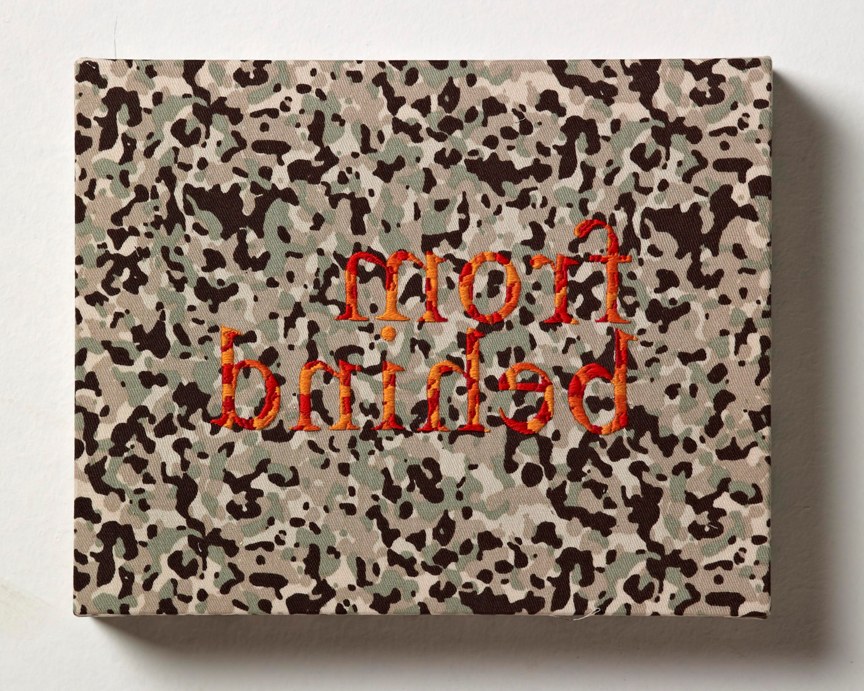 Proseguendo il cammino lungo le arcate che ritmano il corridoio, lo sguardo incontra piccole tele realizzate con stoffe mimetiche su cui sono cucite alcune parole. Esemplare è From Behind (ricamo su tessuto mimetico, 2012) dove, il riferimento del titolo a guardare l’opera ‘da dietro’ è rafforzato dal ribaltamento effettivo della scritta ricamata al contrario, come fosse vista da uno specchio, spingendo l’osservatore ad approssimarsi ad essa per comprenderne l’espediente.