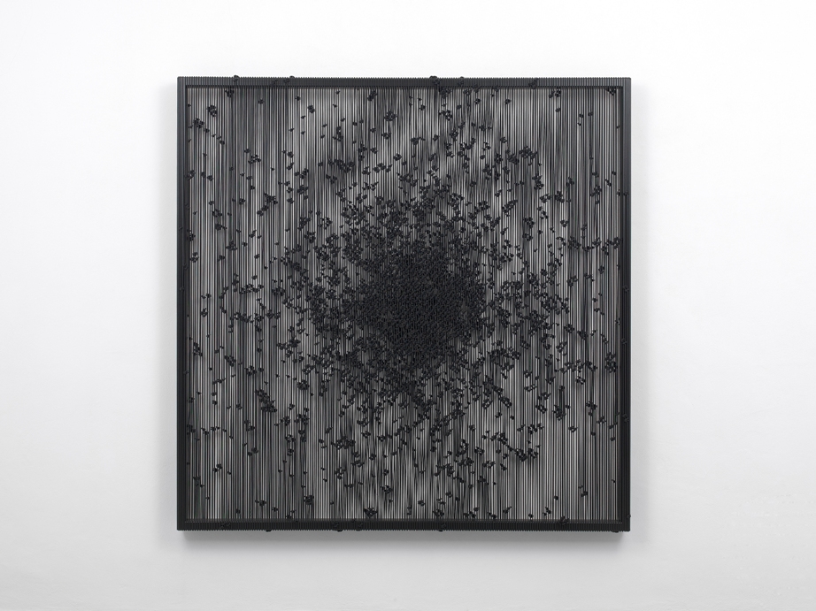 Attorno ad essa si dispiegano, sulle pareti, una serie di opere di medio formato: dalle perforazioni su carta come Parallax View (WT/OR)_09 (2012) ai Fragments. Chiude l’esposizione Black Stars_M55 (poliestere su telaio di acciaio, 2012) ovvero una composizione di corde nere intrecciate rappresentante l’ammasso di stelle numero 55 scoperto dall’astronomo Charles Messier (1730-1817). Il francese, nel lontano Settecento, ha pubblicato un libro in cui ha catalogato ben 110 corpi celesti fissi per facilitare gli astronomi all’individuazione delle comete. Duff è interessato alla trasposizione di tali masse dal segno grafico a quello scultoreo. Ne deriva un’opera tridimensionale composta dal susseguirsi di trame e ritmi infiniti all’interno di un telaio, i cui confini alludono all’immensità del cosmo. Uno spazio idealmente costruito dove migliaia di nodi, realizzati su funi, costituiscono l’unità di misura dell’universo.