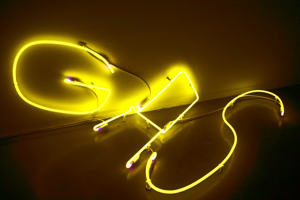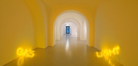 Tale trasposizione è percepibile già scendendo la scalinata d’accesso alla vasta sala dello spazio espositivo, dove la tautologica iscrizione luminosa Gas Light (neon, 2012), composta dai due elementi separati posti ai lati dell’ingresso, inganna l’occhio che in un primo tempo la percepisce collocata su un unico piano per poi accorgersi, durante il suo avvicinamento, della reale distorsione.